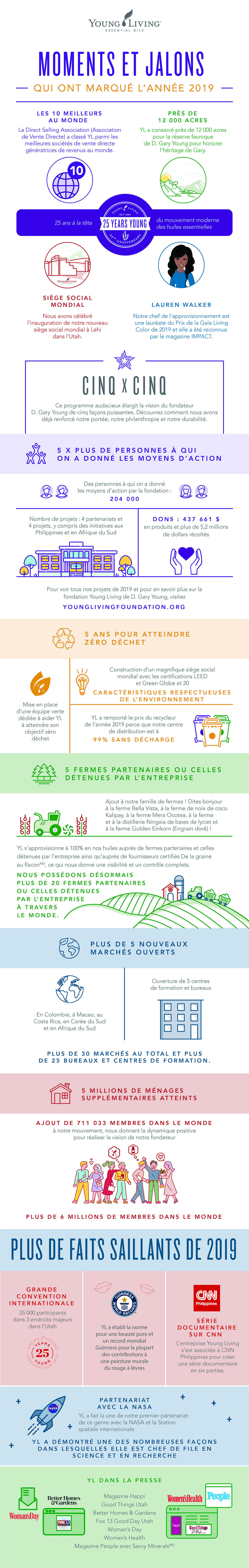 2019 a été une année mémorable pour Young Living, pleine de grandes réalisations, de jalons et de reconnaissance. N’oubliez pas de jeter un coup d’œil sur les faits saillants de notre infographie de 2019, qui comprend le lancement de notre ambitieux engagement 5 × 5 et comment la Direct Selling Association (Association de Vente Directe) a classé Young Living parmi les 10 meilleures sociétés de vente directe génératrices de revenus au monde ! C’est excitant de voir l’incroyable dynamique que nous avons construite en 2019 et nous nous réjouissons de ce que nous accomplirons en 2020.