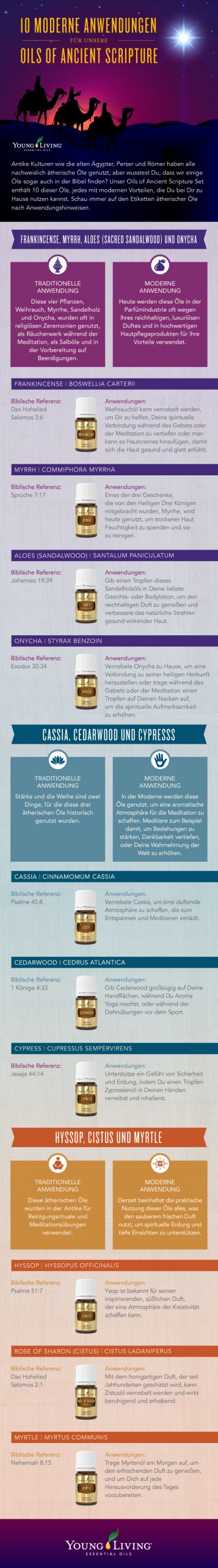 Antike Kulturen wie die alten Ägypter, Perser und Römer haben alle nachweislich ätherische Öle genutzt, aber wusstest Du, dass wir einige Öle sogar auch in der Bibel finden? Unser Oils of Ancient Scripture Set enthält 10 dieser Öle, jedes mit modernen Vorteilen, die Du bei Dir zu Hause nutzen kannst. Schau immer auf den Etiketten ätherischer Öle nach Anwendungshinweisen.