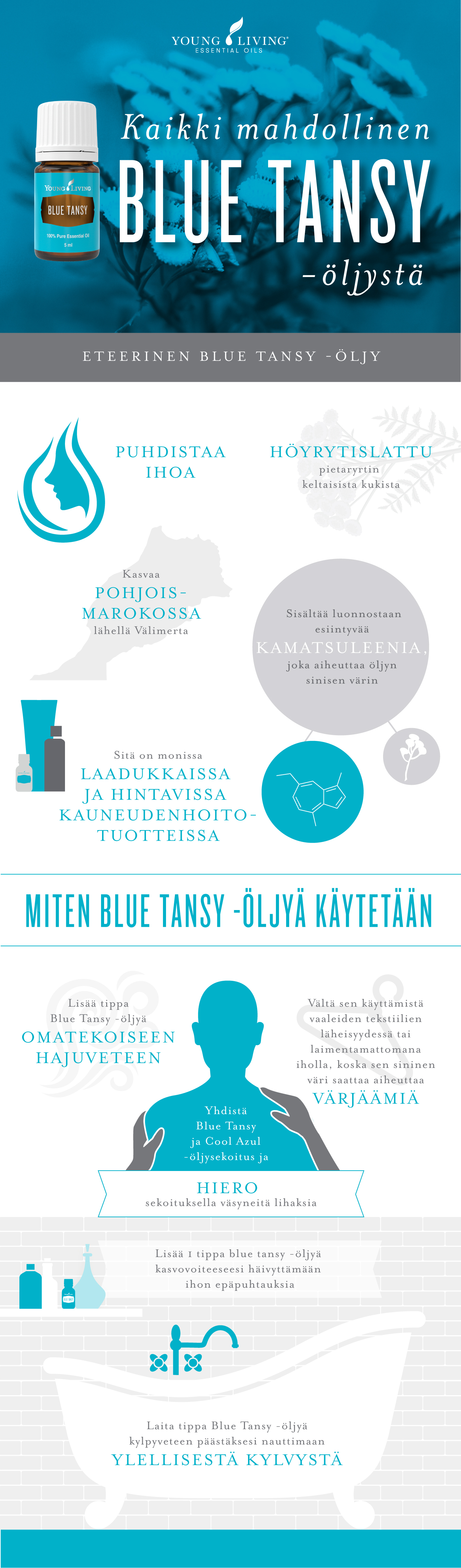 Onko Blue Tansy -öljyä turvallista käyttää paikallisesti? Kyllä. Muistathan kuitenkin, että öljyn sininen väri voi värjätä. Jos asia huolestuttaa sinua, laimenna öljyä. Tee aina ihotesti ennen kuin käytät Blue Tansy -öljyä iholla, tekstiileillä tai muilla pinnoilla.