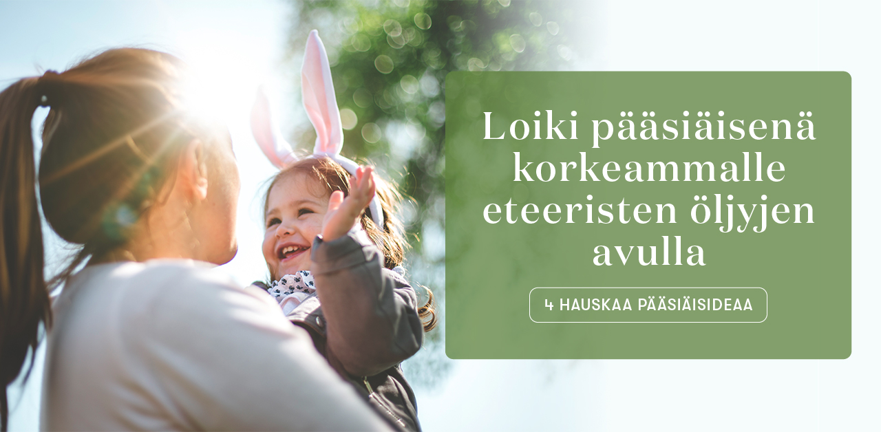 Emme tietenkään ole unohtaneet teitä vanhempia! Virittäydy pääsiäistunnelmaan tekemällä omia eteerisiä öljysekoituksiasi, joita voit käyttää joko hajuvetenä tai vartalovoiteissa. Jatka lukemista löytääksesi ohjeita juhlamieltä nostattavien eteeristen öljysekoitusten loihtimiseen. Muista aina laimentaa öljy ennen kuin levität sitä iholle.