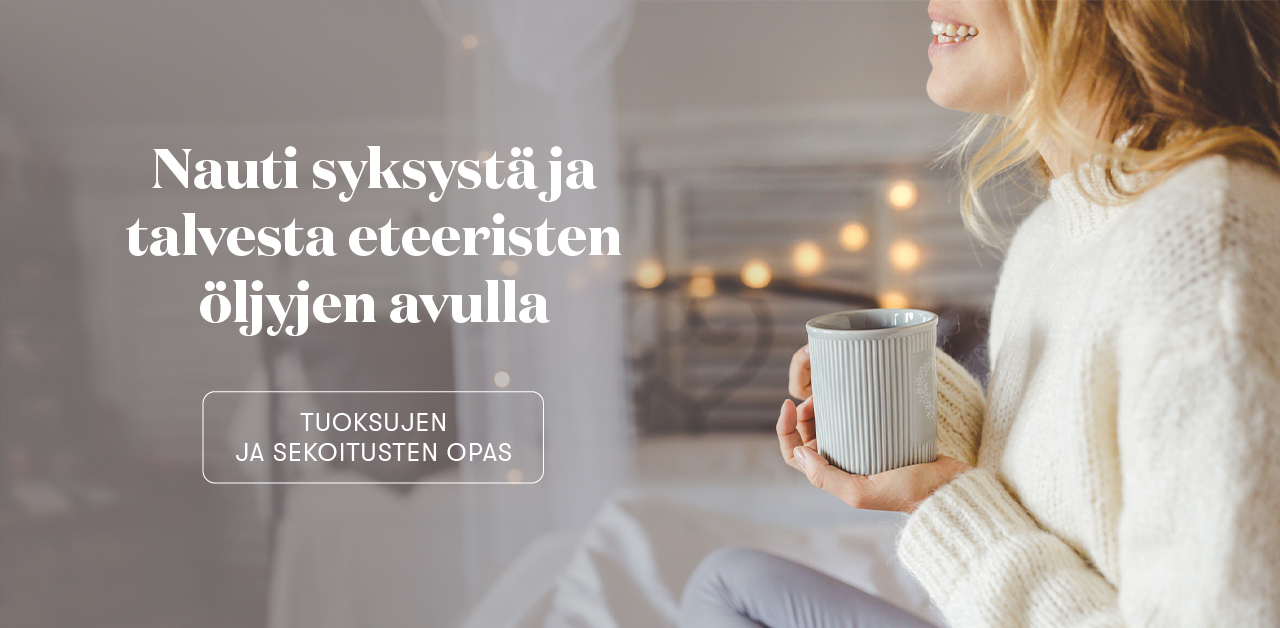 Loppusyksystä ja alkutalvesta sää muuttuu kylmemmäksi ja kirpeämmäksi, joten nyt voit hyvällä omallatunnolla viettää enemmän aikaa kotona. Nämä vuodenajat kutsuvat meitä nauttimaan kodin viihtyisästä, kutsuvasta ilmapiiristä, pehmeistä peitoista, lämpimistä juomista ja tietenkin eteerisistä öljyistä. Tässä blogikirjoituksessa keskitymme eteerisiin öljyihin ja öljysekoituksiin, joiden avulla voit luoda juuri loppusyksyyn ja alkutalveen sopivan tunnelman.