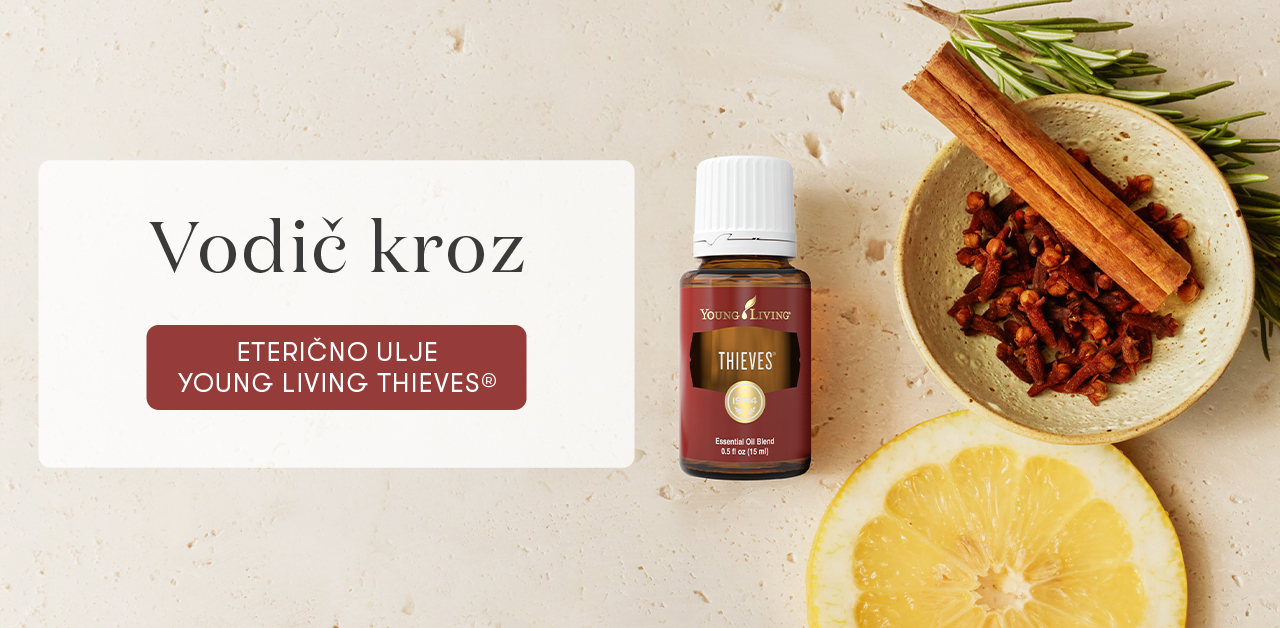 Thieves je potentan spoj eteričnih ulja limuna, klinčića, cimeta, eukaliptusa radiate i ružmarina, koja odišu svježom, laganom i toplom aromom koja tješi osjetila. Thieves možete kupiti kao samostalnu mješavinu eteričnih ulja u bočici od 5 i 15 ml, no ono je i ključan sastojak mnogih drugih Young Livingovih proizvoda za čišćenje doma i osobnu njegu. Naši proizvodi zamjenjuju teške kemikalije oštra mirisa sastojcima na biljnoj bazi, ugodne arome i vrhunske moći čišćenja. Kada se koristite bočicom eteričnog ulja Thieves, možete ga nanijeti na žile kucavice ili vrat kao parfem topla mirisa, a ako se odlučite za neki od naših proizvoda za čišćenje s dodatkom Thievesa, u svježem mirisu i blistavoj čistoći moći ćete uživati u svakoj prostoriji svoga doma.