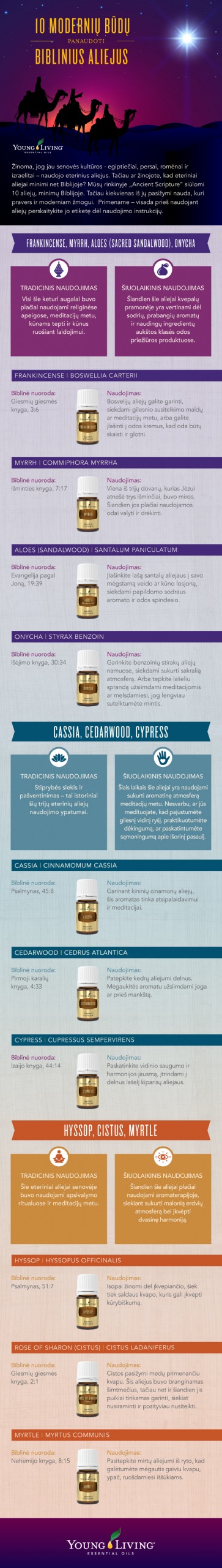 Žinoma, jog jau senovės kultūros – egiptiečiai, persai, romėnai ir izraelitai – naudojo eterinius aliejus. Tačiau ar žinojote, kad eteriniai aliejai minimi net Biblijoje? Mūsų rinkinyje „Ancient Scripture“ siūlomi 10 aliejų, minimų Biblijoje. Tačiau kiekvienas iš jų pasižymi nauda, kuri pravers ir moderniam žmogui. Primename – visada prieš naudojant aliejų perskaitykite jo etiketę dėl naudojimo instrukcijų.