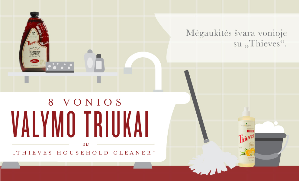 Galbūt ir jūs geriau užsiimtumėte milijonais kitų darbų nei valytumėte vonią… Bakterijos, purvas ir dvokiantys chemikalai lemia tai, jog šią užduotį neretai norisi patikėti kažkam kitam! Tačiau kviečiame išbandyti „Thieves® Household Cleaner“ valiklį. Žemiau esančioje infografinėje medžiagoje pateikiame valymo gudrybes, kuriomis naudodamiesi, atsikratysite kenksmingų chemikalų, o vietoje jų džiaugsitės veiksmingu, natūraliu valikliu, dėl kurio vonios paviršių šveitimas taps malonesnis.