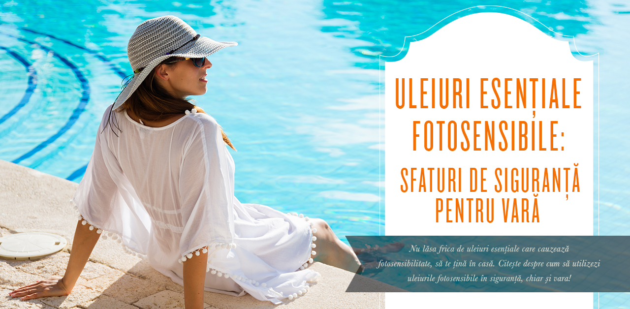 Vine vara cu zilele ei călduroase și știm că toată lumea abia așteaptă soarele. Parcă deja vezi cum va decurge prima zi la piscină- prima aplicare de loțiune de plajă, distribuirea jucăriilor pentru piscină, și apoi în sfârșit supraveghere și relaxare în șezlongul tău favorit. Nu uita însă, în timpul distracției, de utilizarea în siguranță, pe timp de vară, a uleiurilor tale favorite. Informează-te cu privire la uleiurile esențiale fotosensibile înainte de a-ți arunca uleiurile favorite în geantă împreună cu o carte, pentru a te asigura că preferatele tale nu sunt uleiuri esențiale care cauzează sensibilitate la soare.