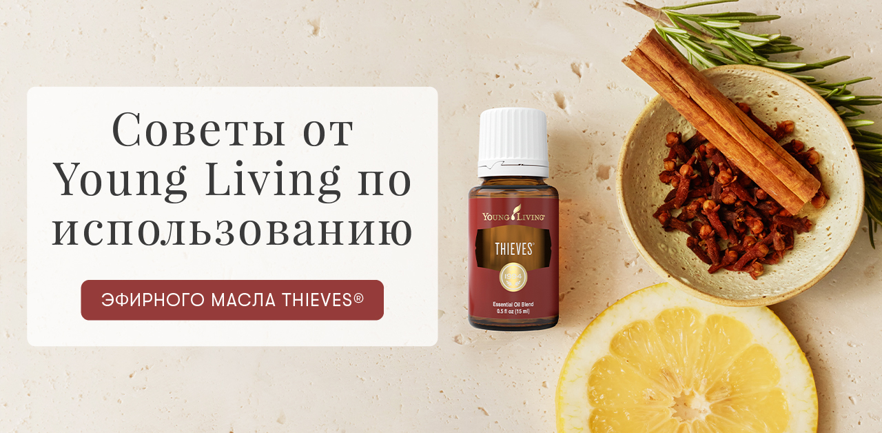 Эфирное масло Thieves® от Young Living, специально разработанное с использованием растительных ингредиентов и чистых эфирных масел, высоко ценится по всему миру за свою универсальность. Созданная под влиянием легенды о французских ворах 15 века, смесь Thieves представляет собой мощную комбинацию эфирных масел лимона (Lemon), гвоздики (Clove), корицы (Cinnamon Bark), эвкалипта лучистого (Eucalyptus Radiata) и розмарина (Rosemary) и обладает теплым пряным ароматом, который украсит любое помещение. В этой публикации мы ответим на самые популярные вопросы о масле Thieves, о его истории, составе и о способах применения другой продукции, в состав которой оно входит.