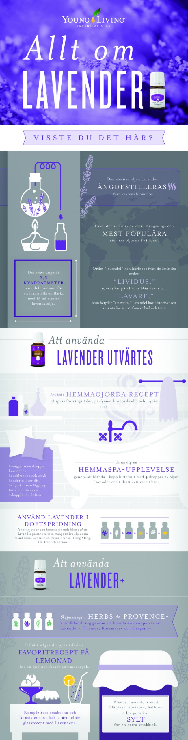 - ANVÄND LAVENDER I DOFTSPRIDNING för att njuta av den kännetecknande blomdoften. Lavendel passar bra med många andra oljor som bland annat Cedarwood, Frankincense, Ylang Ylang, Tea Tree och Lemon.