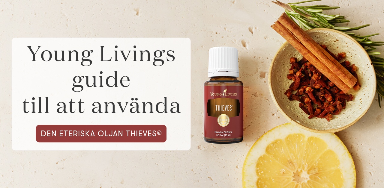 Thieves är en eterisk oljeblandning med en varm och kryddig doft som innehåller en blandning av oljorna citron, kryddnejlika, kanel, eukalyptus och rosmarin. Den finns att köpa som en separat eterisk olja och är även huvudingrediensen i många av Young Livings hushållsprodukter och hygienartiklar. Alla dessa produkter är ett alternativ till starka kemiska lukter med naturligt härledda och växtbaserade ingredienser som rengör på djupet. Den eteriska oljan Thieves kan användas som en kryddig doft på handleder och nacke och våra Thieves-berikade hushållsprodukter passar utmärkt i alla hemmets utrymmen.