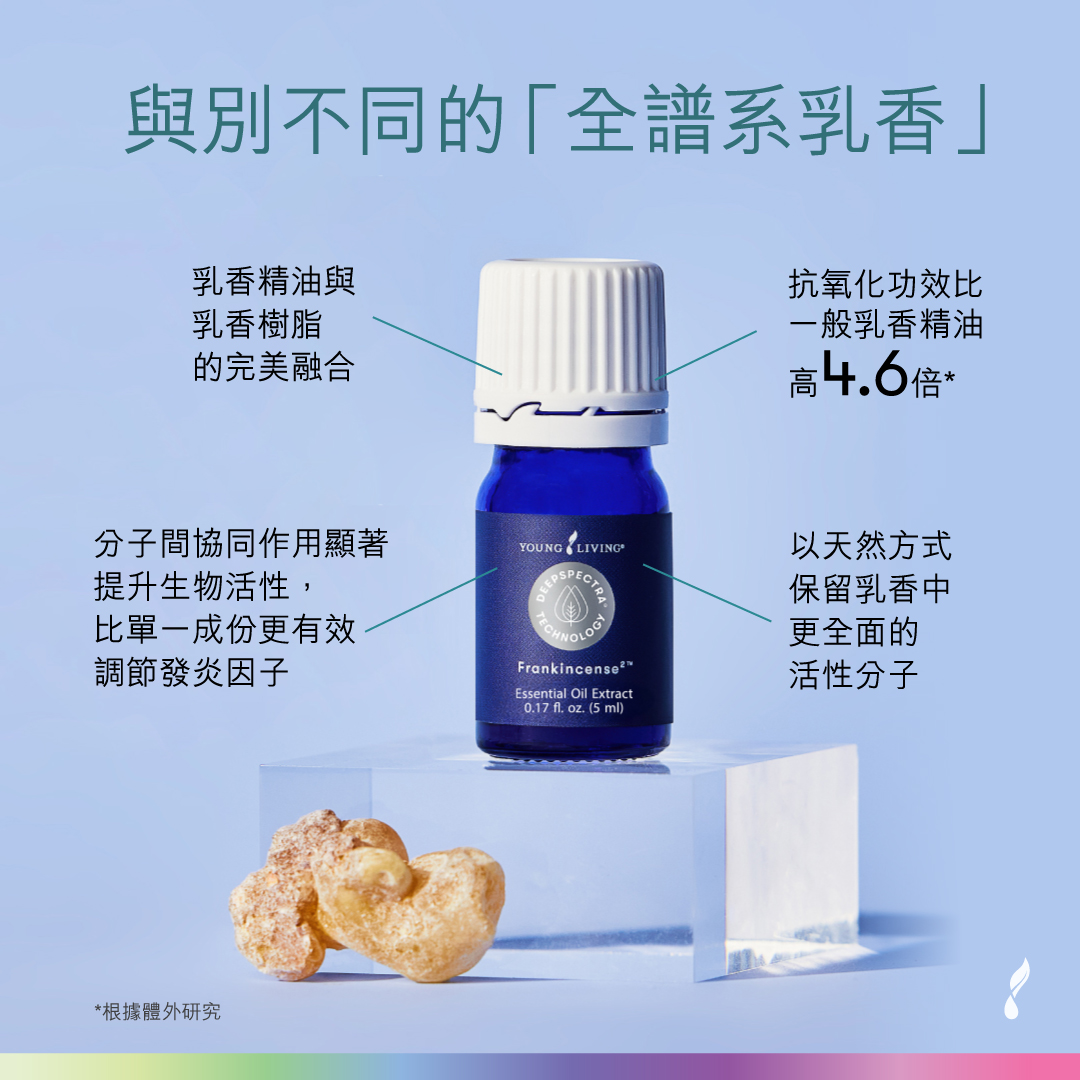 | 得益於DeepSpectra®萃取技術,乳香中更深層次的活性分子得以被天然提取,帶來與別不同的「全譜系乳香」 —— DeepSpectra® Frankincense²!乳香分子之間會產生協同作用,抗氧化功效比一般乳香精油高4.6倍*,實現「整體效能大於部分之和」的效果。以守護地球友好的方式,打造出超越高品質且獨一無二的「全譜系乳香」。