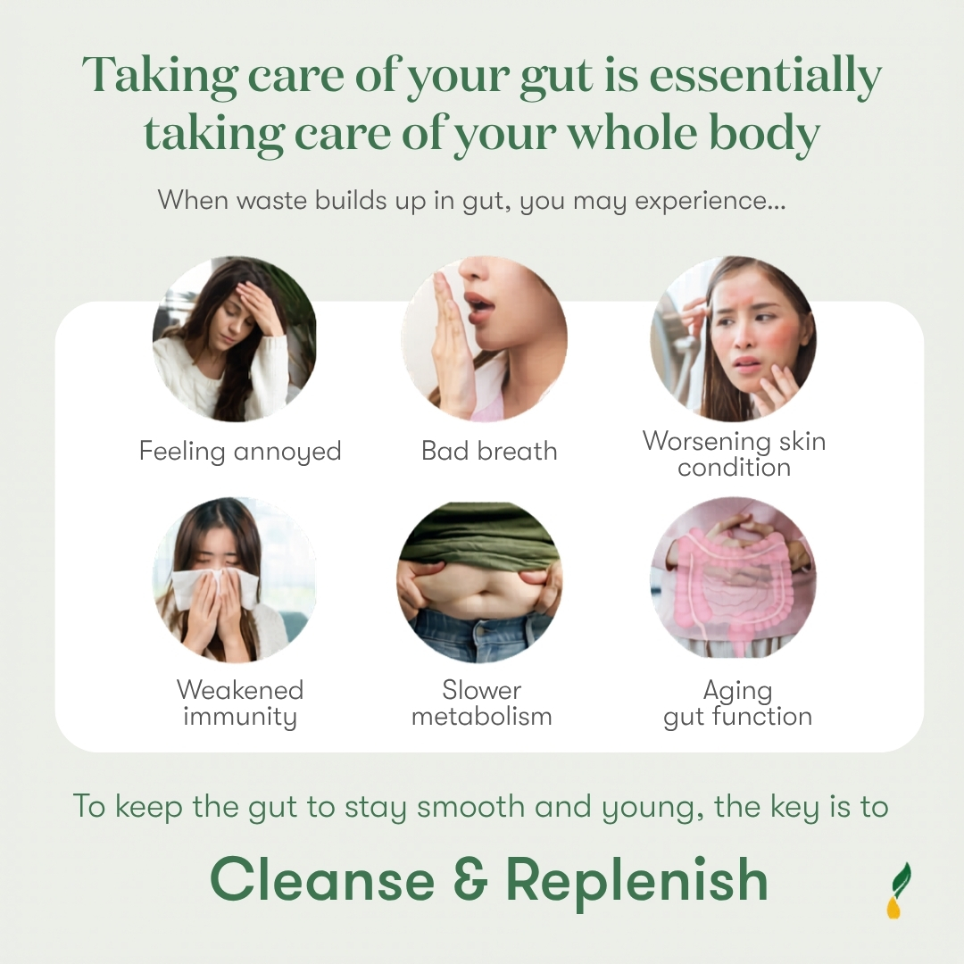 When waste builds up in the gut over time, it can affect digestion and speed up gut aging, which may even further affect skin quality, immunity, and metabolism. Irregular or difficult bowel movements are often signs that gut rhythm is slowing down and its function is gradually declining. Just like skin, gut care should not start only when problems appear. Daily, ongoing care is the key to long‑term health.