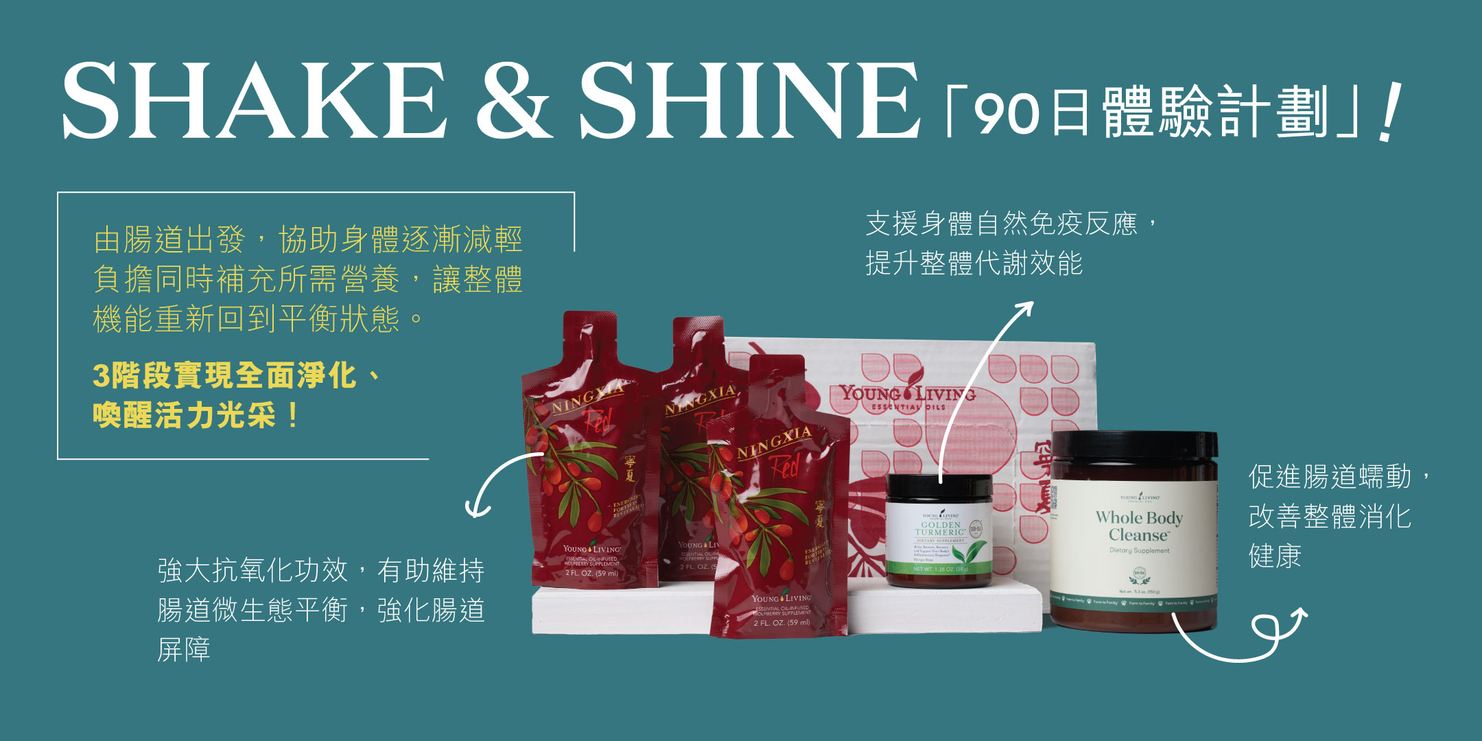 腸道保養並非一朝一夕,而是需要時間累積。YL鼓勵大家一同參與Shake & Shine 90日體驗計劃,透過持續3個月體驗結合Whole Body Cleanse、寧夏紅及黃金薑黃粉的Shake & Shine活力套裝,重整身體節奏,帶動全身輕盈蛻變。以循序漸進的方式,讓腸道慢慢適應,建立更穩定順暢的節奏,找回更輕盈自在的狀態!