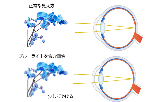 可視光線(目に見える光)の中で、もっとも波長が短く強いエネルギーを持っているブルーライト。ブルーライトを含む光は、その強いエネルギーによって目の表面にある角膜(フィルター)や水晶体(レンズ)では吸収されず、さらに奥の網膜(フィルム)までストレートに到達することで網膜が直接ダメージを受けると言われています。さらに加えて、波長が短い光は散乱しやすく像がチラついたりぼやけたりするため、目が無意識にピントを合わせようと頑張り続けてしまい、レンズを調節する筋肉(毛様体筋)が疲れて眼精疲労の原因になる、とも言われています。