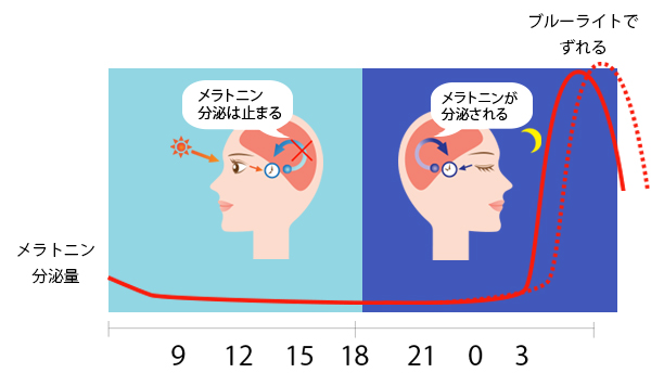 ひとの体内時計は、目に入り込む光の量によってコントロールされています。本来であれば既に日が落ちているはずの時間帯に、太陽と似たような光(=ブルーライト)が目に届いてしまうと、脳が「昼間」と勘違いするため、睡眠を促すメラトニンという物質が分泌されなくなります。寝つけない、ぐっすり眠れない、途中で目が覚める…など、睡眠の質に不安を覚える人が増えたのは、実は深夜のスマホチェックでブルーライトを目にすることで、体内時計が乱れているからかもしれません。