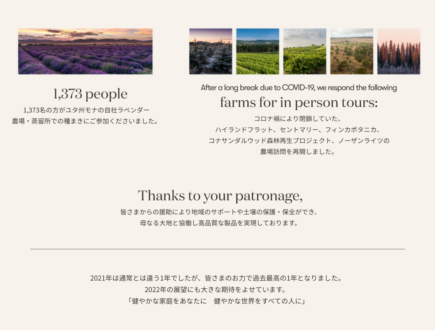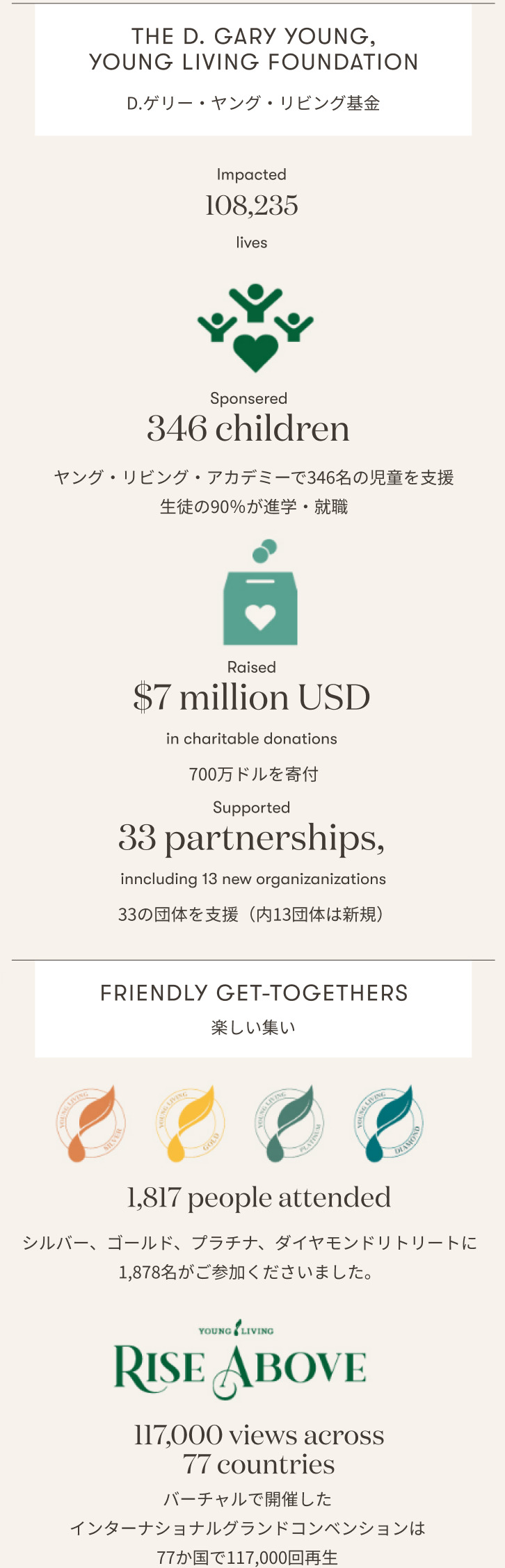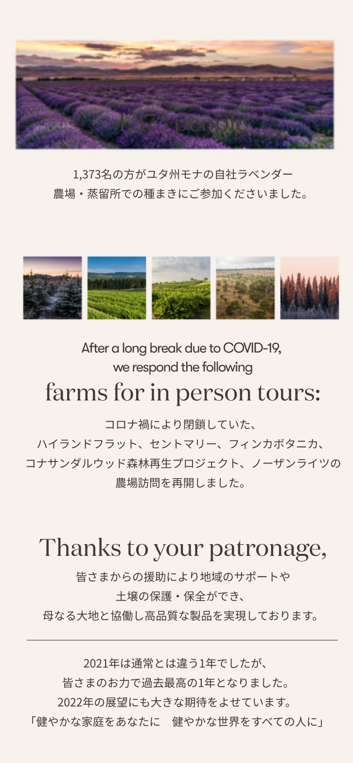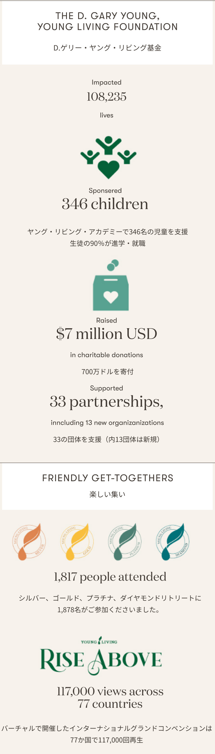 2021年のヤング・リビングを振り返って|全ての家庭にエッセンシャルオイルを 2021年のヤング・リビングを振り返って 多くの浮き沈みはありましたが、2021年も会員の皆さまと力を合わせて乗り越え、 ヤング・リビングのサクセスストーリーを共に作り上げました。 155か国で展開することで、「全ての家庭にエッセンシャルオイルを」 という目標にこれまで以上に近づいています。 adminjapan2022-02-03T09:05:27+09:0002/02/2022|イベント, 各地イベント情報, 新着情報・キャンペーン|0 Comments Share This Story, Choose Your Platform! FacebookTwitterPinterest About the Author: adminjapan Related Posts 10%OFF 今月の注目製品!|長く愛される5つの定番製品を10%OFFでお届け! Gallery 10%OFF 今月の注目製品!|長く愛される5つの定番製品を10%OFFでお届け! 2月1日(日)〜25日(水)YLおトク便限定キャンペーン|前向きな気持ちを育ててくれる3つの香り Gallery 2月1日(日)〜25日(水)YLおトク便限定キャンペーン|前向きな気持ちを育ててくれる3つの香り 新春!新規登録特典 もれなくニンシアレッド1本増量キャンペーン |2026年も新規登録を応援します! Gallery 新春!新規登録特典 もれなくニンシアレッド1本増量キャンペーン |2026年も新規登録を応援します!