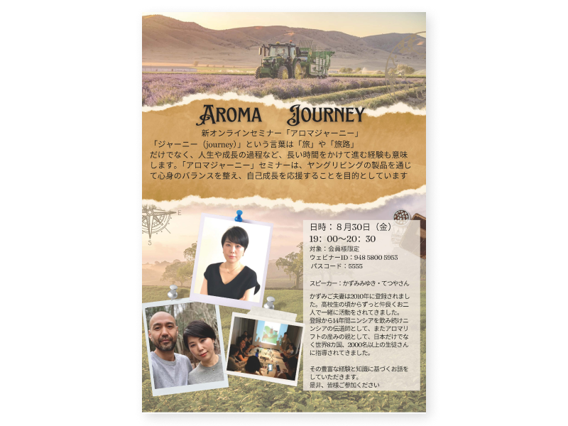 皆さんのヤング・リビングのアロマ体験を、さまざまな経験を持つ方々と共有しながら進めるこの旅にぜひご参加ください。