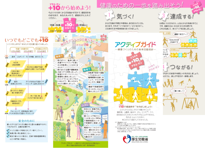 厚生労働省が提唱している「健康づくりのための身体活動指針(アクティブガイド)」では、年齢に関係なく毎日10分多く体を動かすことを「プラス10(テン)」と呼びかけています。これにより、少しでも身体を動かすための具体的な方法が示されています。