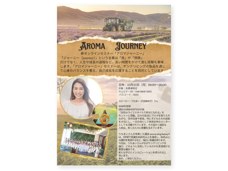 この「アロマジャーニー」では、ヤングリビングの製品を通じて心身のバランスを整え、自己成長をサポートすることを目指しています。