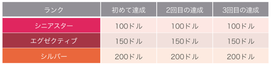 シニアスター、エグゼクティブ、またはシルバーランクを初めて達成した場合、最大3回(3か月)まで下記のボーナスを受け取ることができます。