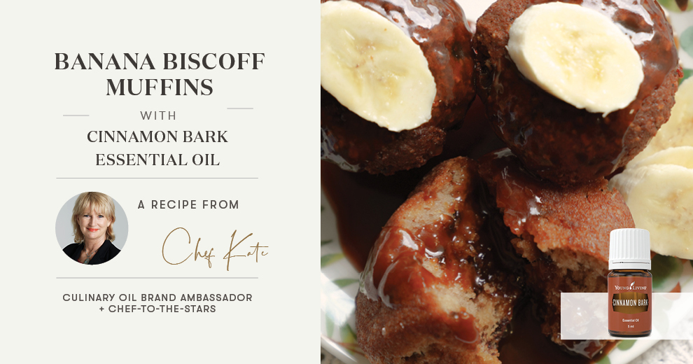 These Banana Biscoff Muffins are a delicious treat that your family and friends are sure to enjoy. Cinnamon Bark Essential Oil gives a warming spicy twist and goes great with the banana. The filling is so luscious, you’re going to love it!