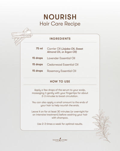 - Nourish hair: Nourish your hair with a blend of rosemary, lavender and cedarwood essential oils to hydrate and rejuvenate your hair, leaving it soft, shiny and full of life: