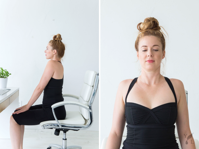 4. Stay in the twist for three breaths. After three complete breaths, let go of the chair, face forward, pause, and breathe. Repeat, turning to the right side instead.