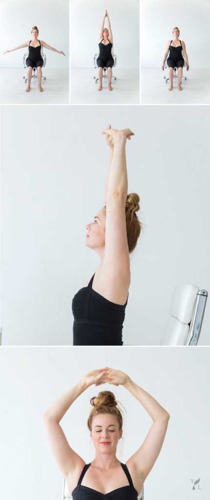 2. Raise your arms above your head, interlink your fingers, and flip your palms to face the ceiling. Stay for three breaths. While you inhale, press down through your feet, elongate your spine, straighten your elbows, and press your palms toward the ceiling. Exhale, allowing your elbows to bend and your spine to relax. Repeat three times.