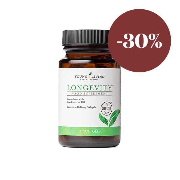 Longevity je každodenní doplněk stravy s patentovanou směsí esenciálních olejů, který je vytvořený tak, aby vám pomohl udržet moderní životní styl. Každá měkká želatinová kapsle obsahuje vysoce kvalitní směs oleje z pomeranče, tymiánu, hřebíčku a kadidlovníku. Díky tomuto složení je snadné užívat esenciální oleje vnitřně bez potíží s odměřováním, mícháním a chutí po požití.