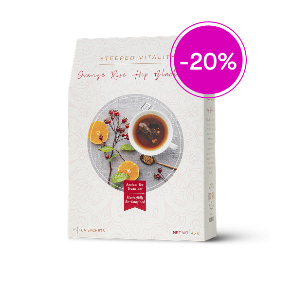 Bio-Assam Blätter (Camellia sinensis), Bio-Pu’erh Blätter (Camellia sinensis), Bio-Lakitzwurzel (Glycyrrhiza glabra), natürliche Geschmacksgeber, Bio-Hagebutte (Rosa canina), Bio-Orangenschale (Citrus sinensis).