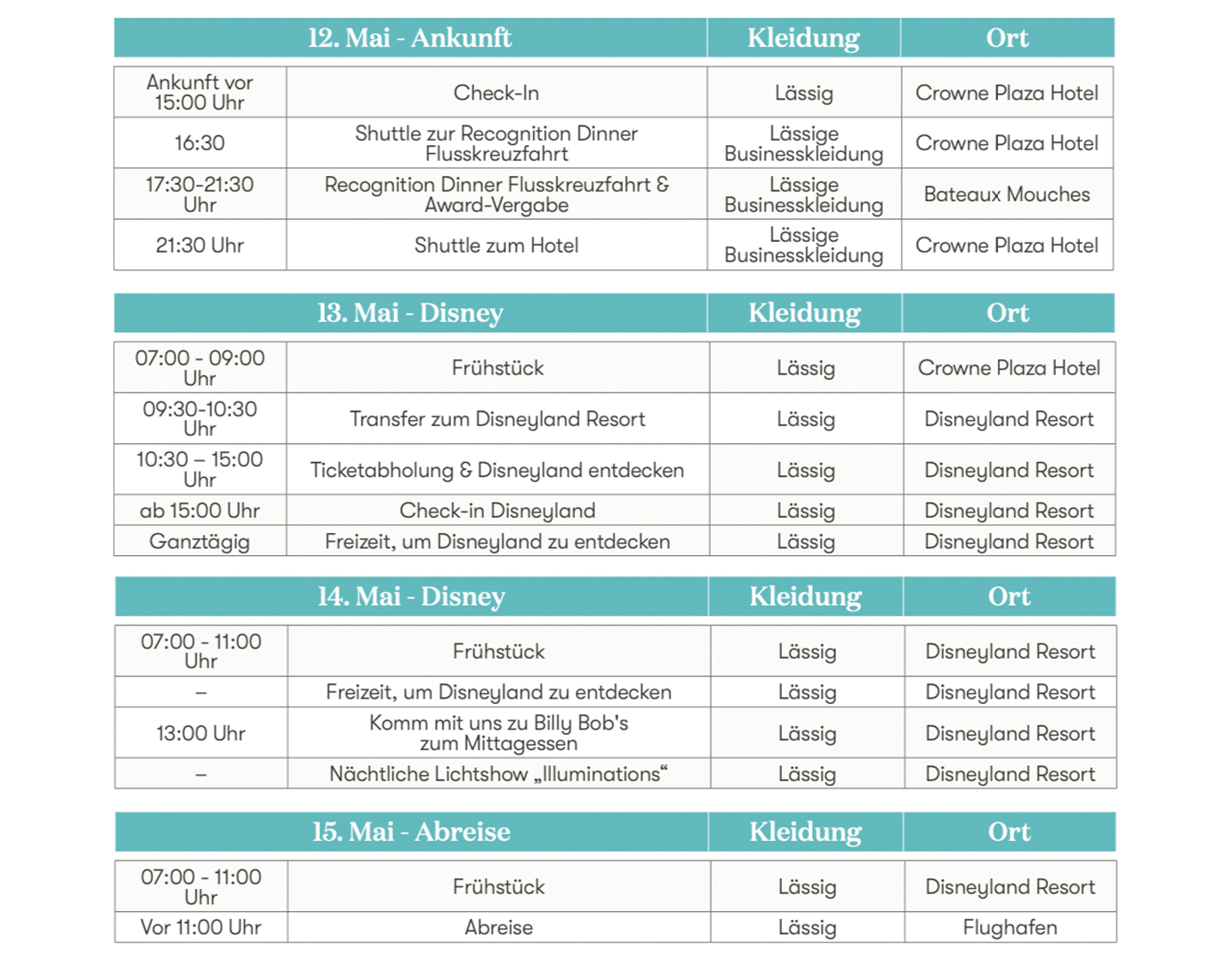 3 Nächte Unterbringung*, Zugtickets vom Flughafen zum Hotel in Zentral Paris (Ankunft), alle Transfers während des Events, Transfer von Disneyland zum Flughafen (Abreise), Disneyland Tickets für 2 Tage, Recognition Dinner & Flusskreuzfahrt.TRANSPORT