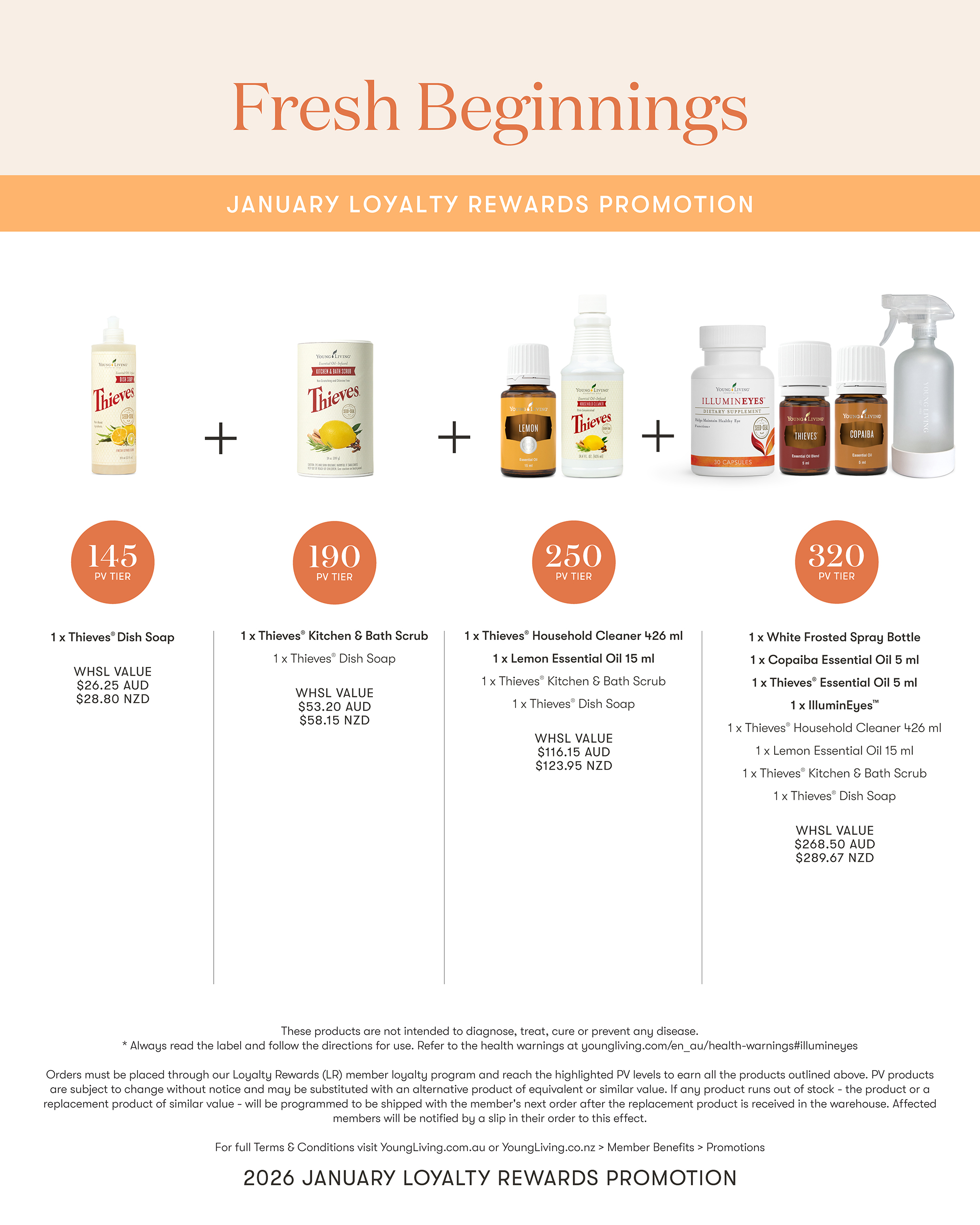 For full Terms & Conditions visit YoungLiving.com.au or YoungLiving.co.nz > Member Benefits > Promotions