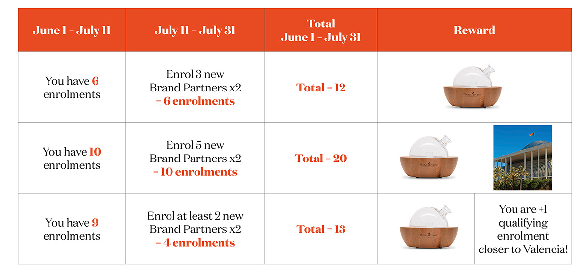 - From July 11 – July 31, 2022: Your qualified enrolments count double! This means that each new enrollee with a qualifying order gets you 2 steps closer to your reward. Example: Between June 1 and July 11, I enrolled 8 new enrollees with a qualifying order. From July 11, I only need to enrol 2 new enrollees with a qualifying order to qualify for Level 1 and win one Aria Diffuser only (8+4), or 6 new enrollees with a qualifying order to qualify for Level 2 and win one Aria Diffuser only plus 150 € voucher or equivalent in my currency towards my travel and accommodation costs at the European Convention in Valencia (8+12). Please find more examples below: