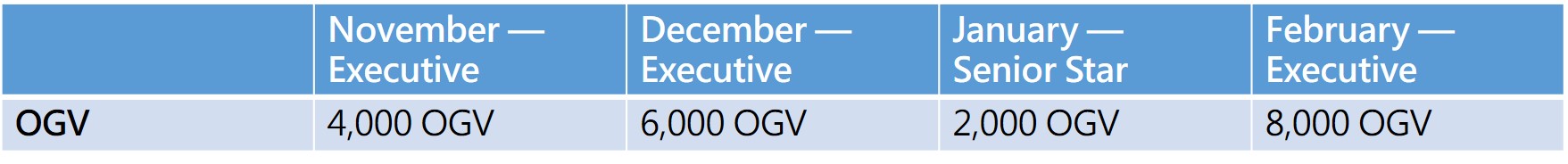Achieves accumulated OGV of 18,000 among the 3 highest months when being paid as Executive or above;