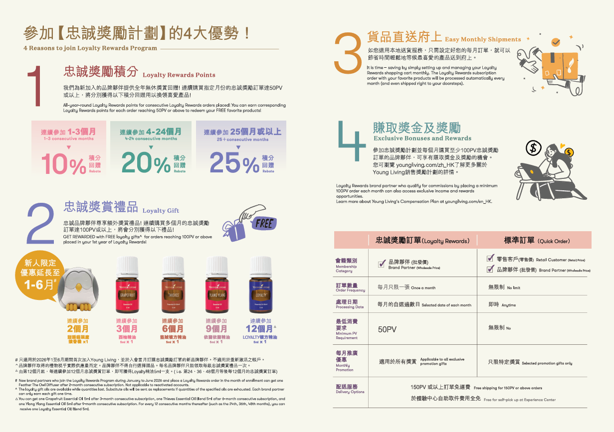 Make sure you’re never without your must-have Young Living products! Take advantage of the convenience of Loyalty Rewards, Young Living’s loyalty subscription program that delivers your favorite products each month hassle-free from our door to yours. Available exclusively to Young Living wholesale Brand Partner, this loyalty subscription is packed with benefits. New brand partners who join Young Living during January to June 2026 and place a Loyalty Rewards order in the month of enrollment can enjoy additional loyalty gifts valued at HK$618 (not applicable to reactivated accounts)!