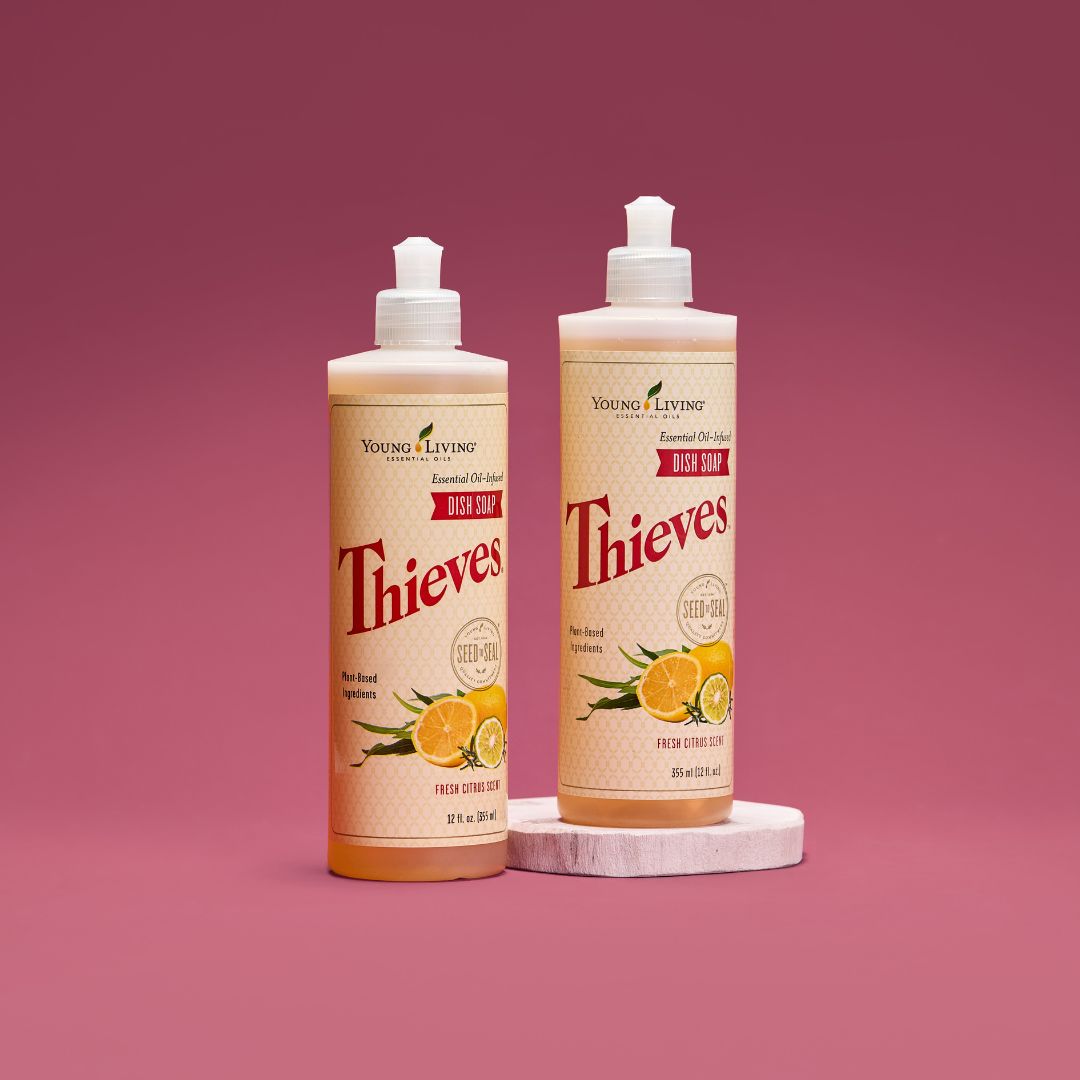 With naturally derived ingredients, Thieves® Dish Soap effectively cleans your dishes without chemicals, dyes, or synthetics. Young Living pure essential oils—Thieves, Jade Lemon, and Bergamot—work with other plantbased ingredients to leave your dishes sparkling clean.