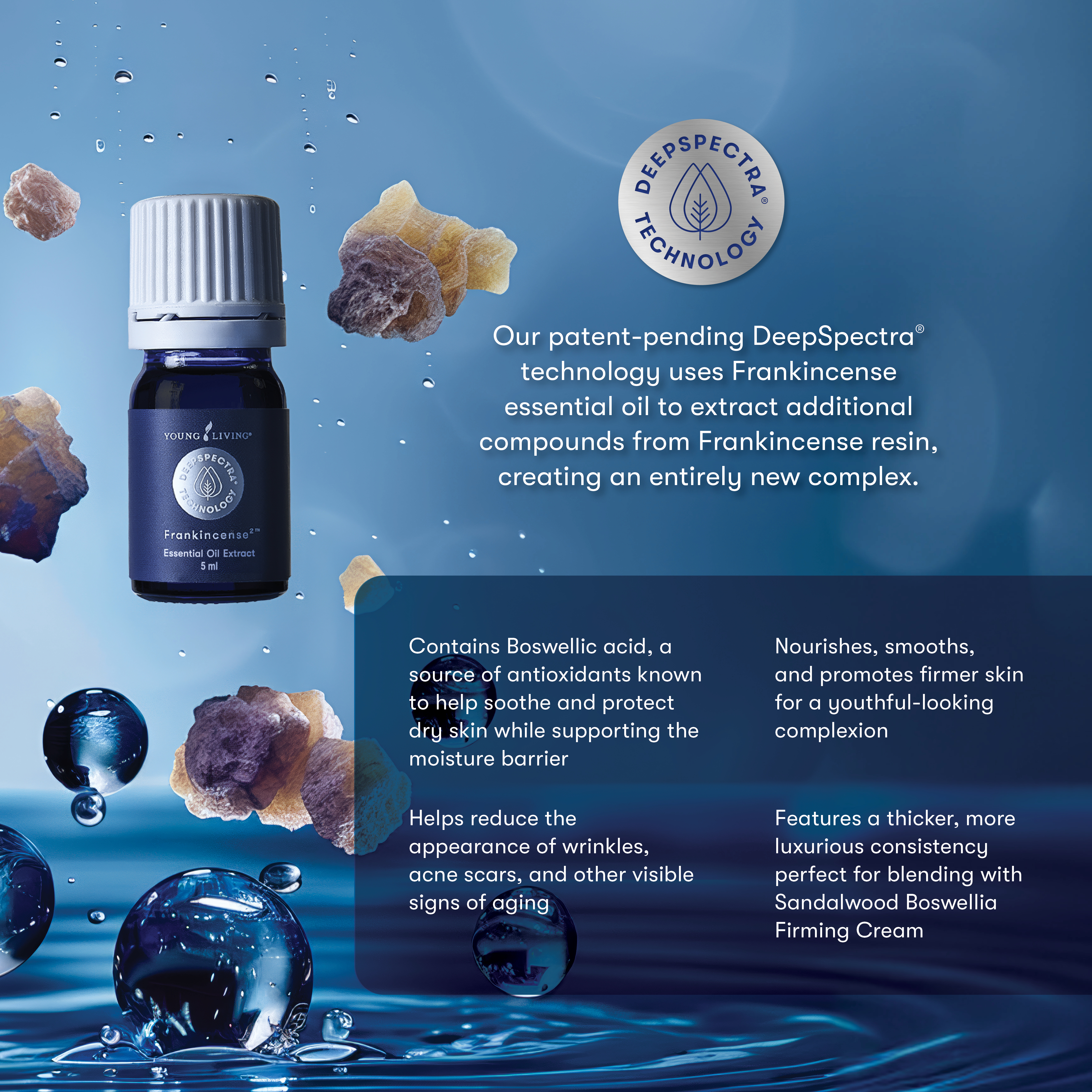 Enter a new realm of plant goodness with DeepSpectra Frankincense2. This unique and brilliant fusion of Frankincense essential oil and frankincense resin compounds unlocks a brand-new essential oil infusion that protects, smooths and moisturizes dry skin.