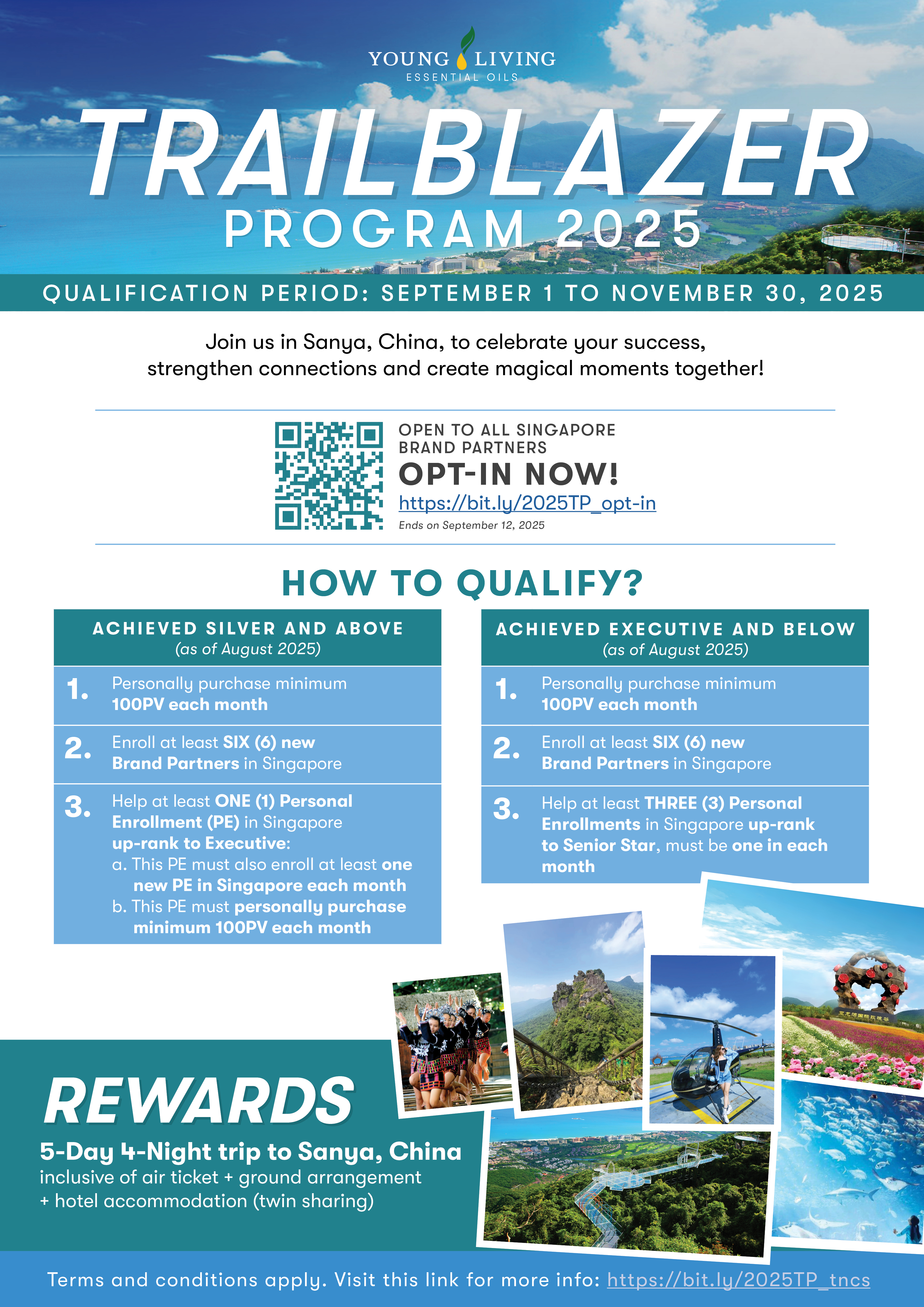 This Program is open to active Young Living Singapore Brand Partners who are in good standing with Young Living; are 18 years of age or older as of September 1, 2025; and meet the following TWO (2) criteria: