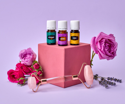 1. Prepara un serum facial con 6 gotas Lavanda + 2 gotas Limón + 2 gotas Menta + 5 gotas de V‑6; con tu rostro limpio y seco, aplícalo la mezcla y masajea con tu rodillo facial.