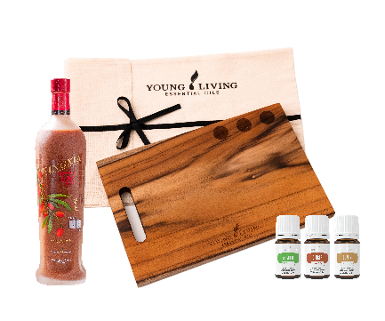 Incluye: Tabla de corte de madera de teca, NingXia Red 750 ml, aceites esenciales vitality: Cumin, Cilantro y Ginger.