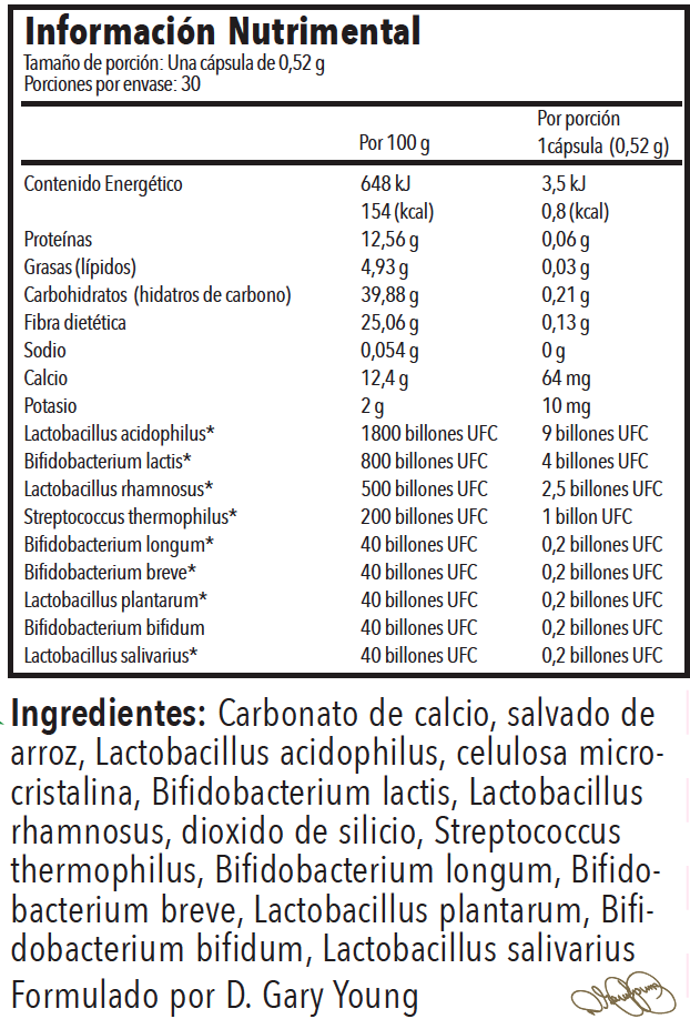 Carbonato de calcio, salvado de arroz, Lactobacillus acidophilus, celulosa microcristalina, Bifidobacterium lactis, Lactobacillus rhamnosus, dioxido de silicio, Streptococcus thermophilus, Bifidobacterium longum, Bifidobacterium breve, Lactobacillus plantarum, Bifidobacterium bifidum, Lactobacillus salivarius.