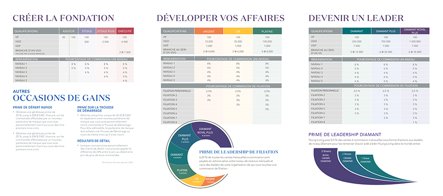 Si vous êtes prêt à créer votre propre entreprise pour atteindre vos objectifs personnels, notre généreux Régime de rémunération des ventes vous aidera à y parvenir. Il s’agit de prendre soin de notre famille Young Living et d’un autre exemple de notre engagement envers le bien-être du corps tout entier. Grâce à notre approche à trois niveaux, nous avons mis au point une structure efficace pour vous aider à développer votre entreprise avec une rémunération qui vous récompense au fur et à mesure de votre croissance.