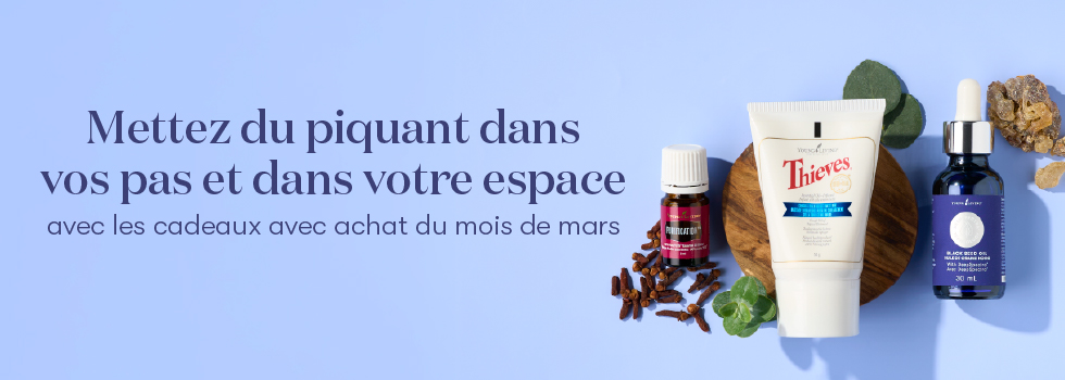 Commande Récompenses de Fidélité: Huile de grains noirs avec la technologie DeepSpectra + le baume pour la poitrine contre le rhume et la toux de Thieves + le mélange d'huiles essentielles Purification + 10 $ de crédit sur les produits (pour les commandes passées entre le 1er et le 5 mars seulement).