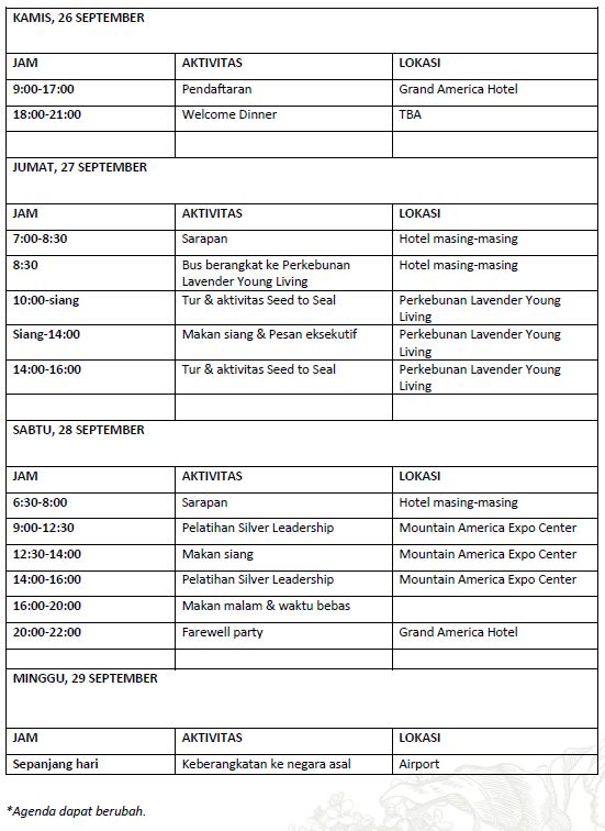 Untuk pertanyaan lain seputar acara, silakan email ke events@youngliving.com atau hubungi kantor Young Living di negara Anda.