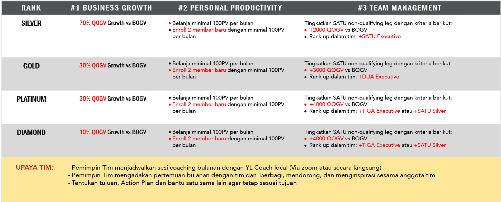 Hanya Member Silver sampai Diamond yang bisa berpartisipasi dalam YLB. Member Crown Diamond dan Royal Crown Diamond diijinkan untuk ‘buy-in’ sementara sesi training leadership hanya diperuntukkan bagi pemenang YLB.