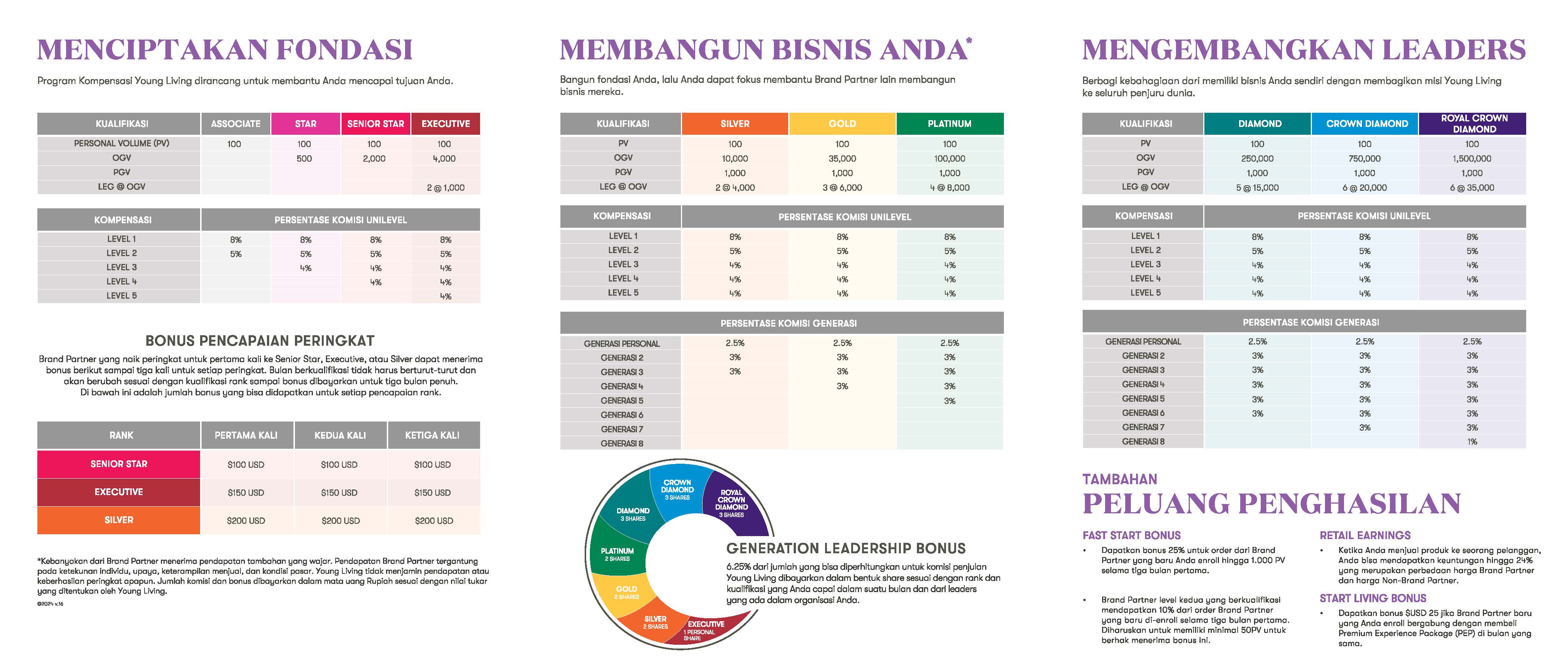 Dapatkan rewards untuk setiap pembelian yang dilakukan oleh Member dalam organisasi Anda! Program kompensasi Young Living menggunakan tiga tahap pendekatan yang dapat membantu strategi Anda untuk membangun bisnis Anda, melangkah ke level yang lebih tinggi, dan mendapat kompensasi sesuai dengan pertumbuhan Anda.