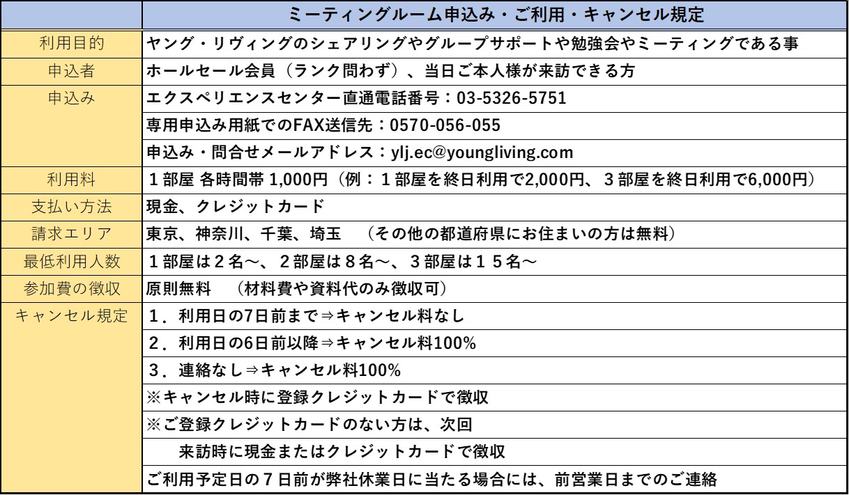 エクスペリエンスセンターでは会員の皆さまがご利用いただけるミーティングルームをご用意しております。製品シェア会、勉強会や講習会、お茶会やグループのミーティングなど、ヤング・リヴィングをシェアする場として是非ご活用ください。