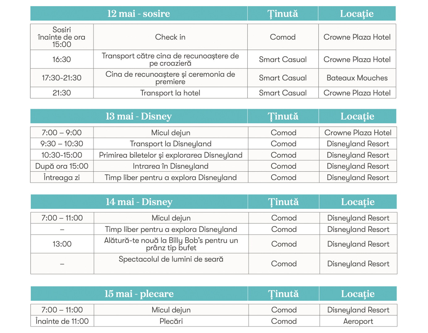 R: Toți participanții vor sta la hotelul Crowne Plaza pe data de 12 mai și la hotelul Disney’s Newport Bay Club în perioada 13-15 mai. Confirmarea cu privire la camera de hotel în care vei fi cazat/ă îți va fi trimisă prin e-mail cu aproximativ câteva săptămâni înaintea evenimentului.