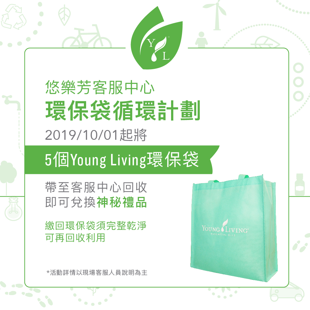 將5個乾淨完整的「Young Living環保袋」帶至悠樂芳客服中心回收,即可兌換神祕贈禮!