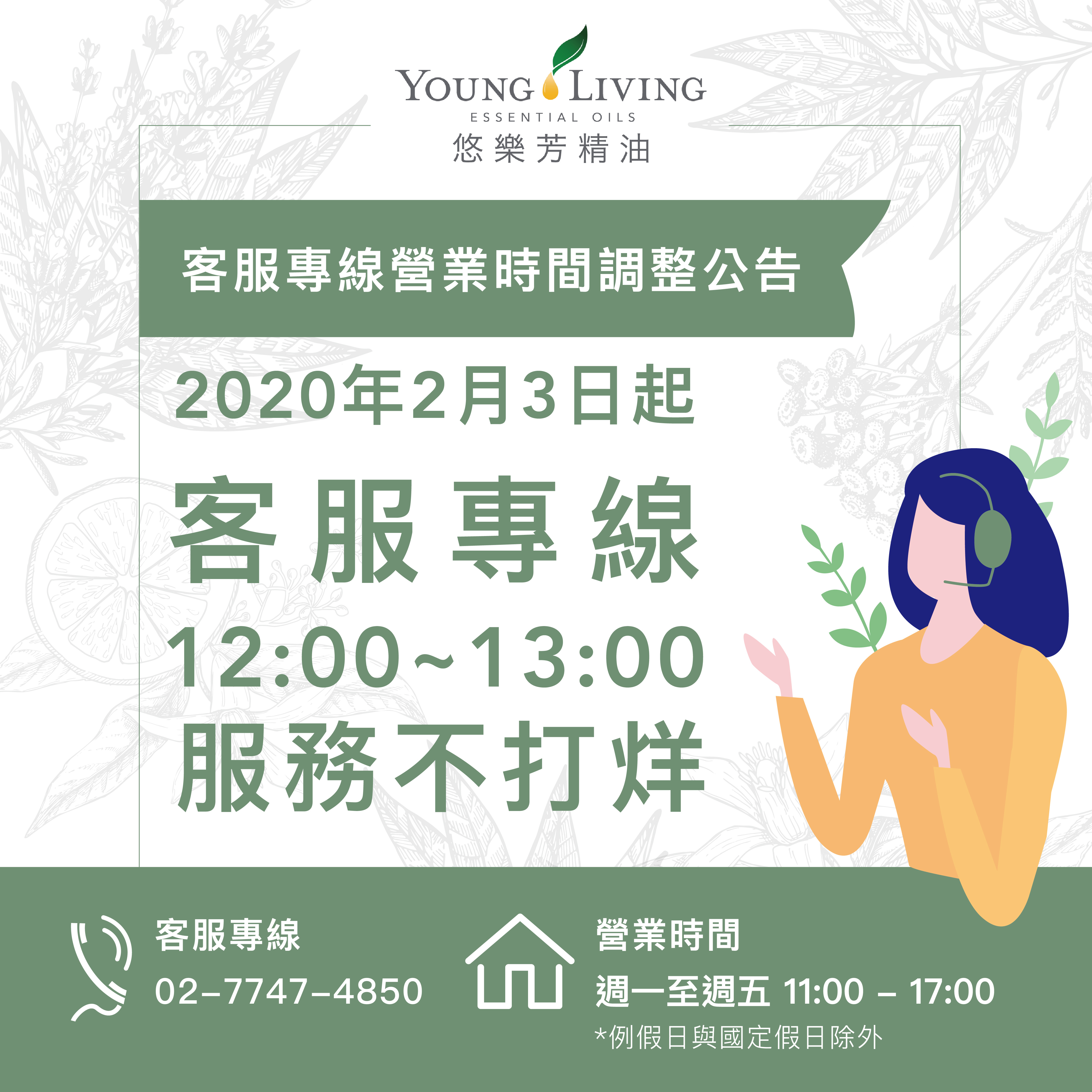 悠樂芳客服專線正式從2/3起,於週一至週五中午時段(12:00p.m.~01:00p.m.)持續接聽來電至05:00p.m.歡迎喜愛悠樂芳的朋友多加利用,與我們一起熱線不間斷!