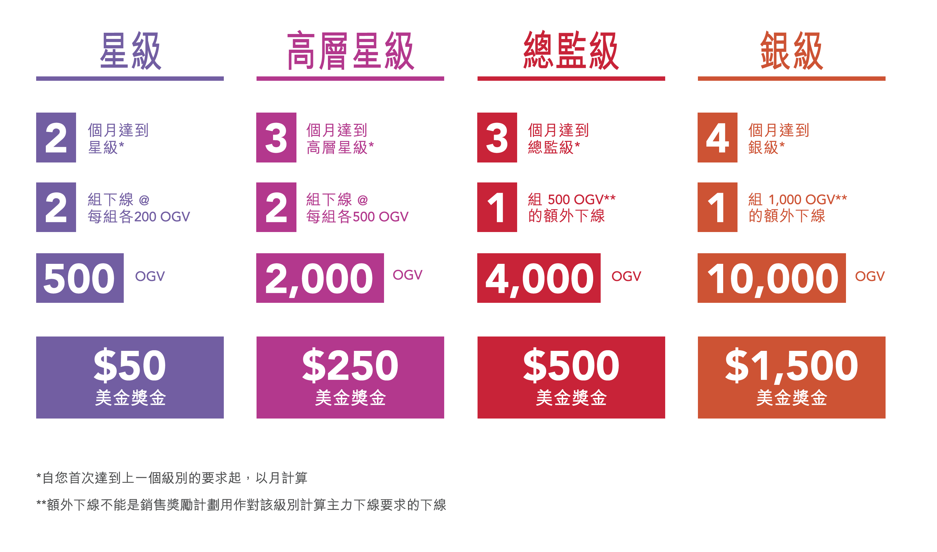 我們新推出的銀級晉階獎金計劃,是另一個讓我們能恭賀您對分享Young Living的動力、熱情與喜愛的方式。銀級晉階獎金的規則幫助您建立能持續發展的事業,代表您每次晉階時除了獲得現金獎賞外,我們還能表揚您的成就!