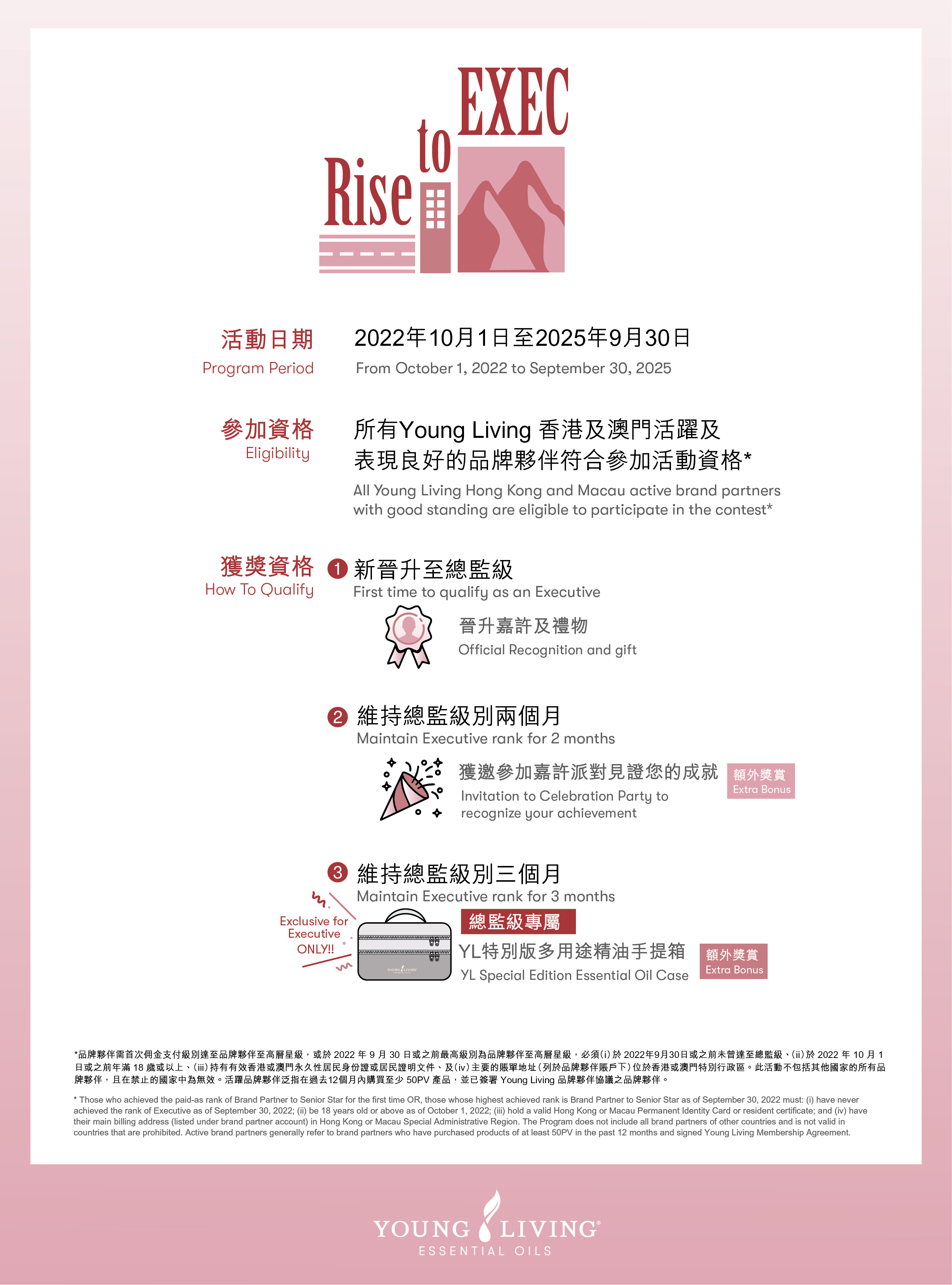 Exec推廣活動,旨在激勵及獎勵所有有機會達成總監級別的品牌夥伴勇於向目標進發!達成目標除了可以獲邀參加嘉許派對,更有機會得到Young